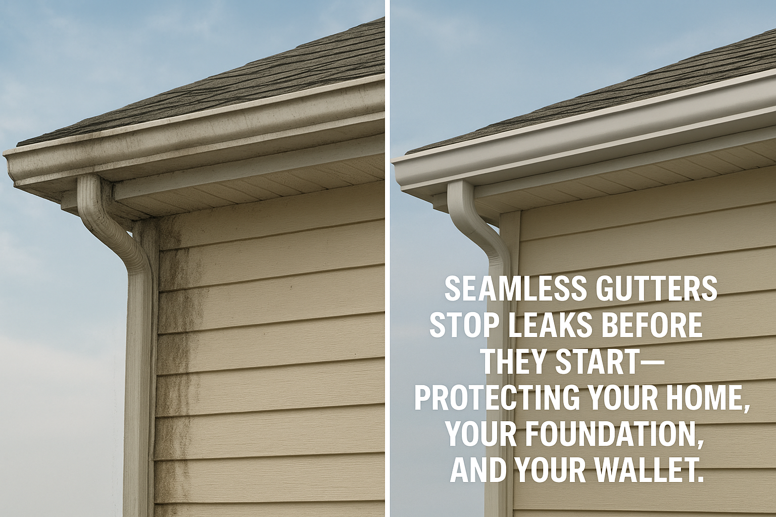 Rainwater that isn’t properly channeled can collect around your foundation, causing cracks, shifting, or even basement flooding. Our seamless gutters guide water away from your home — protecting what’s underneath it.